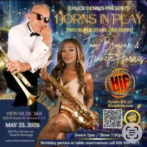The South Bay is about to experience a night of pure musical fire as Horns In Play brings two powerhouse performers — Jeanette Harris and Tom Browne — to the stage for an electrifying evening of jazz, soul, and horn‑driven excellence. This is another standout event in the Jazz Funk Soul At The West music series, curated by the incomparable Chuck Dennis, and it’s happening at one of Torrance’s hottest new venues. Indeed, Jazz Funk Soul at the West: H.I.P. – Featuring Jeanette Harris & Tom Browne is sure to deliver an unforgettable night for music lovers.