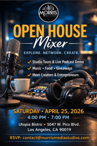 Los Angeles doesn’t just make culture — we record it, remix it, and amplify it. And this April, Morris Media Studios is opening the doors for a one‑of‑a‑kind Open House Mixer designed for podcasters, creatives, entrepreneurs, and anyone ready to step into the mic‑lit magic of LA’s storytelling scene.