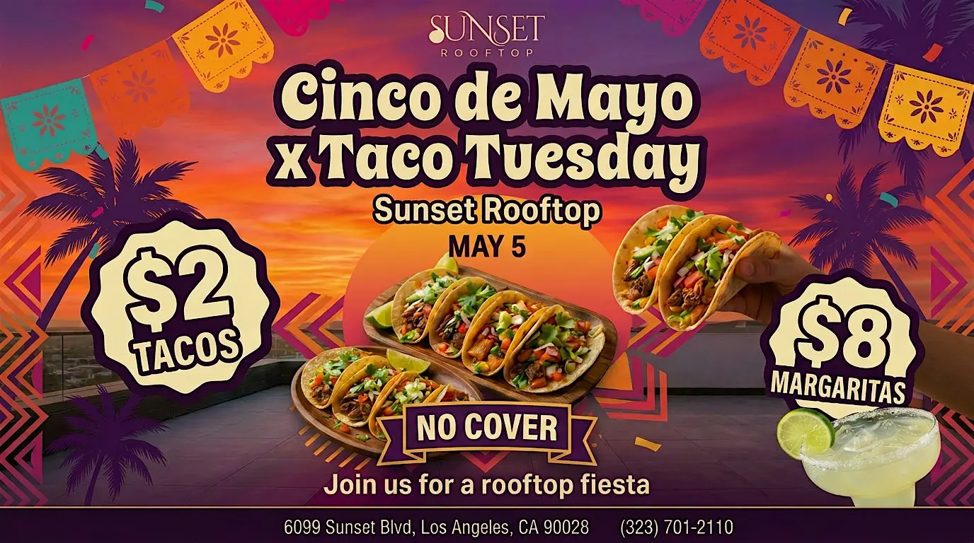 ¡Ven a celebrar Cinco de Mayo con tacos, música y buena onda este martes en nuestro spot favorito!🌮 Cinco de Mayo at Sunset RooftopCelebrate Cinco de Mayo in the heart of Hollywood at Sunset Rooftop — your favorite 21+ hookah lounge with food, drinks, music, and all‑day vibes.Enjoy $2 tacos and $8 margaritas from open…