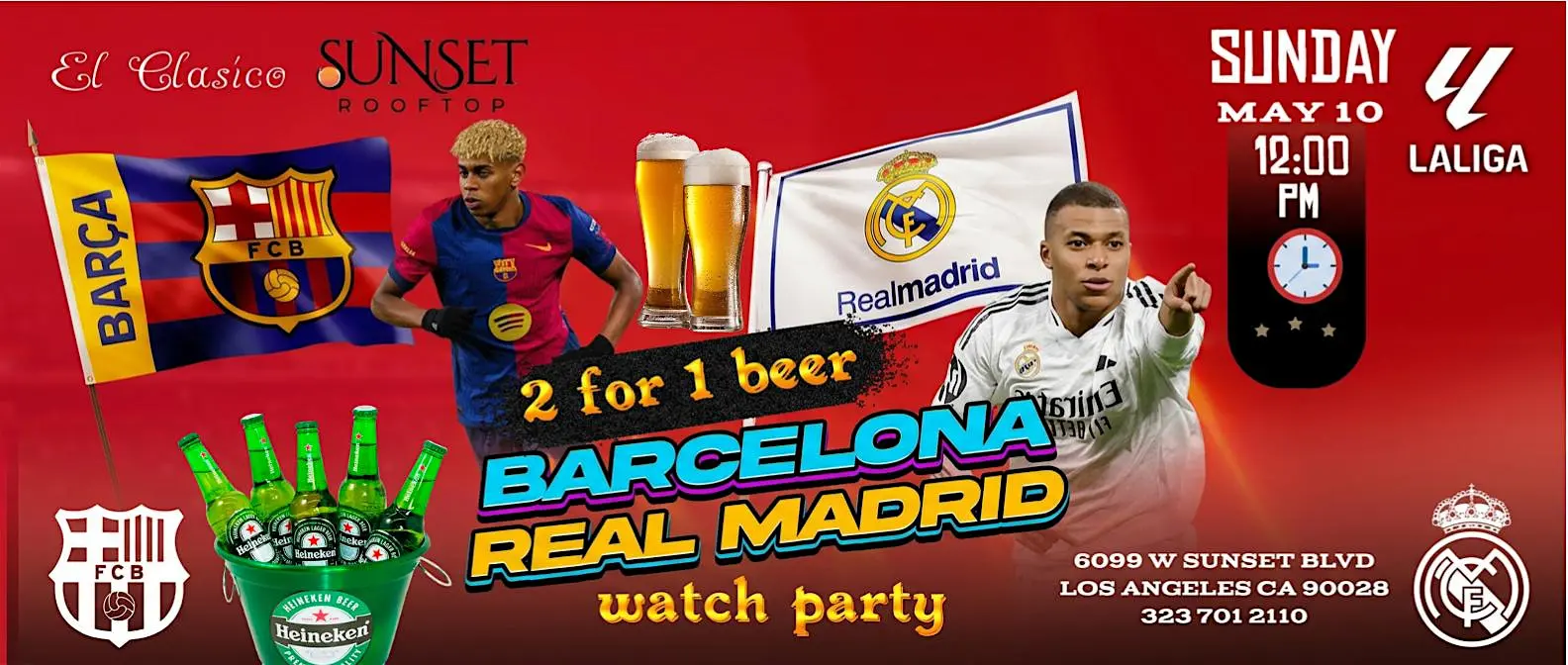 Join us for the ultimate EL CLÁSICO watch party – cheer on Real Madrid vs Barcelona live with fans! EL CLÁSICO VIEWING PARTY @ SUNSET ROOFTOP⚽ EL CLÁSICO: Real Madrid…